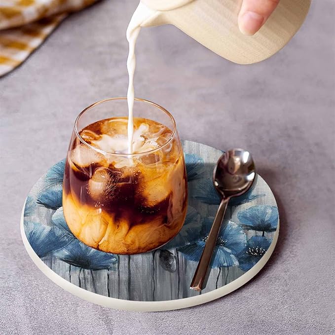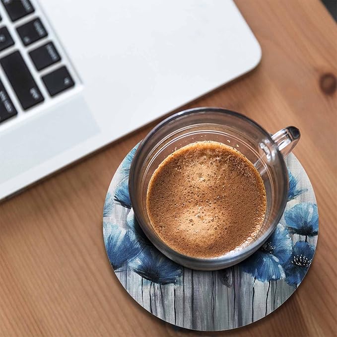 Blue Art Poppy Flowers Anti Slip Coasters Watercolor Oil Painting Beautiful Floral Cups Place Mats for Table Home Decor 4 Inches Living Room Kitchen Coffee Table,2 Pcs