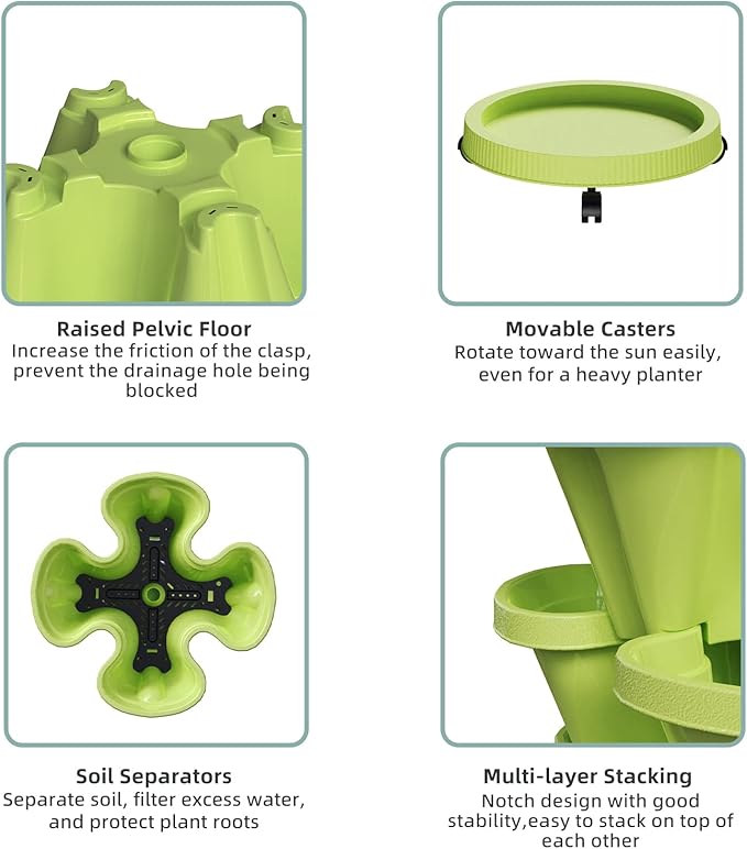 Strawberry Stacking Planters, Vertical Garden Tower, 5 Tiered Stackable Herb Vegetable Planters with Movable Casters and Bottom Saucer Indoor and Outdoor - Green