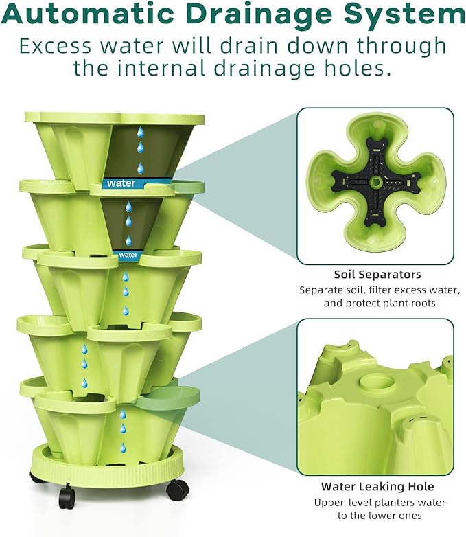 - 5 Tier Vertical Planter - 5 tier stacking planter, made of BPA-free material, can hold up to 20 different plants, such as strawberries, spinach, leaf lettuce, arugula, and mustard greens, and a few smaller herbs and flowers. Plus, it's the perfect vessel for strawberries as the berries cascade over the container lip.