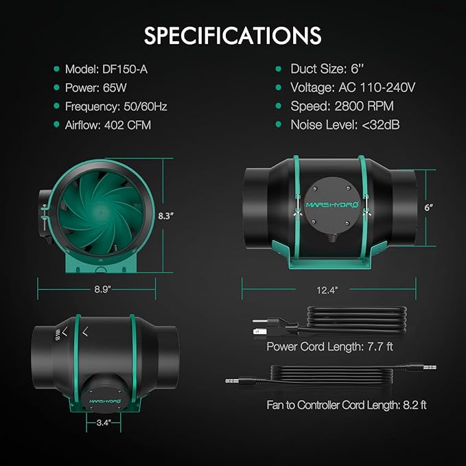 - 【402CFM Adjustable&Efficient Ventilation System】The inline fan blades have a mixed flow design to provide active air to your growing space, the fan runs at 2800 RPM,adjustable from 0 to 100%,and provides 402CFM of airflow.Only 32 dB noise.1050+ RC 48 Australian Virgin Charcoal with 25ft length flex ducting,effectively filters impurities and odors from the air.