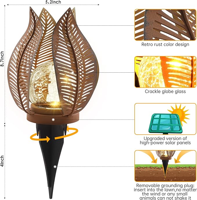 - Unique Shape Design:This is a uniquely designed outdoor garden decor solar lights, using high-quality metal leaf, each piece is lifelike.While absorbing sunlight during the day, it can perfectly decorate your garden. Even better, the glass lampshade has been treated with irregular cracks, which makes the light projected feel comfortable.Solar yard art enrich the joyous atmosphere in your home, and make the surrounding environment full of beauty and romance