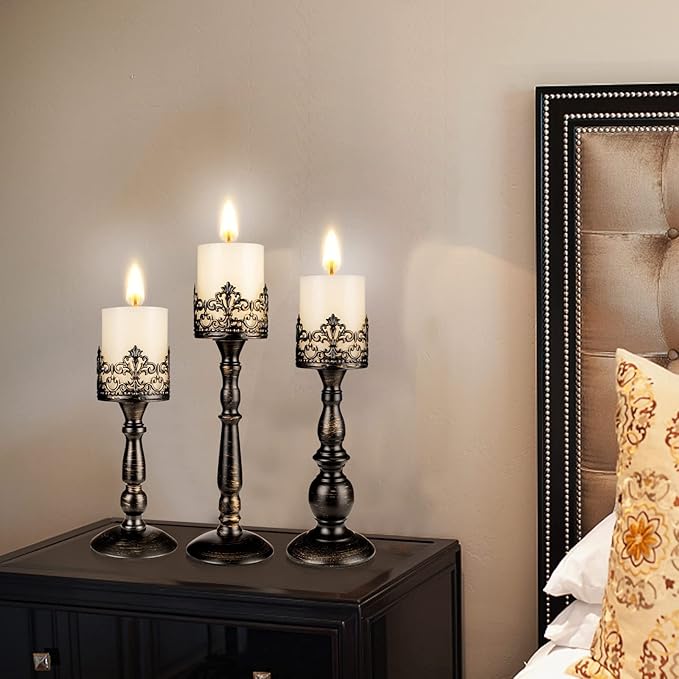 - INCLUDING: 3x distressed black candle holders(Candles not included). Height: Small size: 9" (23cm), Medium size: 11''(28cm), Large size: 12" (30.5cm). All candle plate diameter are 3.15''(8cm). Check if your candle size is suitable before purchasing. Additionally, it also includes an installation manual, and the candle holders require simple self-assembly.