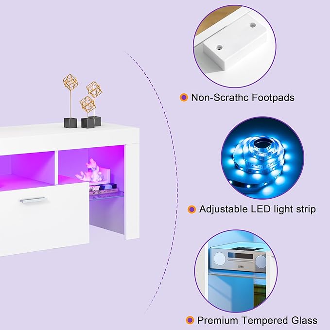 - 【Adjustable LED System】-This LED TV stand has a built-in Bluetooth LED light with 20 light colors and 4 light change modes. There are two control modes: remote control and cell phone bluetooth, you can use the remote control or cell phone bluetooth to adjust the color and brightness of the light, very convenient.