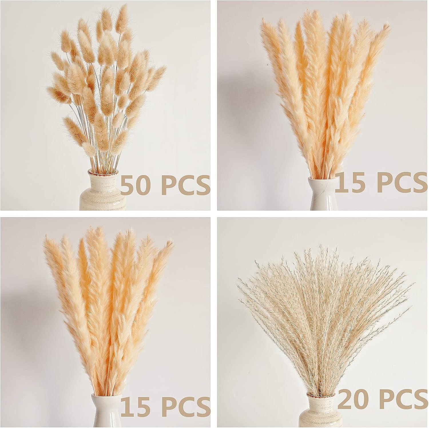 - More then one kind of pampas grass bouquet: carefully selected natural dried pampas grass decor, try to avoid deformation and breakage of dried pampas grass, 100 pieces of pampass grass contain 50 small pampas grass, 20 reed grass, 30 white pampas grass decor, (pampas grass vase not included) fill your vase, you can match it with different dried pompas floral bouquets according to your preference