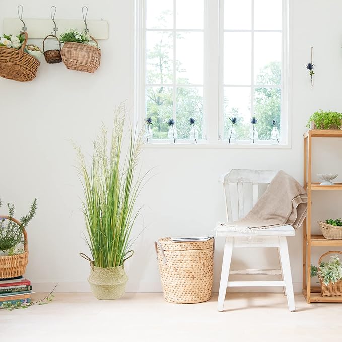 - 1.This faux plant features close to natural green grass with 5 white silk reed flowers, all inside a durable and solid flowerpot. Artificial pampas grass is 47 inches high.base with a black plastic pot in 5'' dia ,5.9''high.it’s easy to put it in a nice bigger planter as desired.
