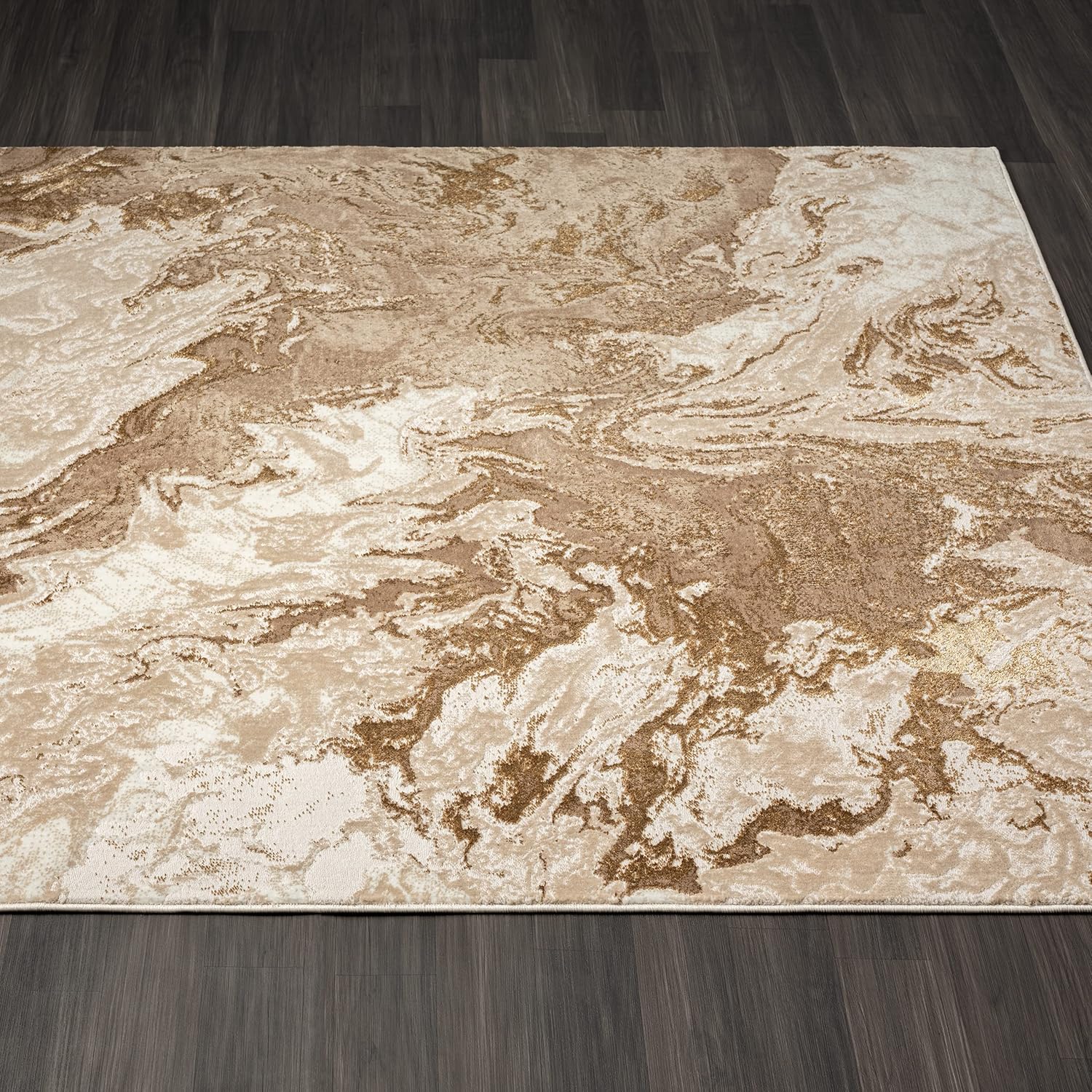 - UNIQUE MARBLE PATTERNS: Its wavy marble patterns features dominant hues of beige, brown, and white, with gold accents. This area rug suits both modern and contemporary décor styles. Warm LED bulbs add a yellow tint visually. Cool or white LED bulbs make rug appear lighter.