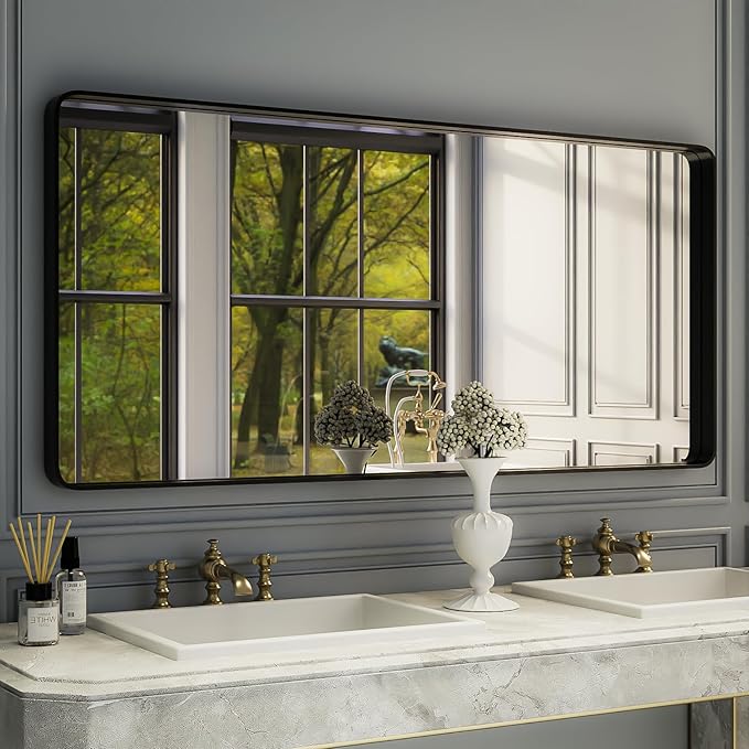 ISKM Large Black Matte Mirror for Bathroom 60" x 28" Round Corner Wall Mounted Mirror Modern Rectangle Metal Framed Bathroom Mirror for Wall Hangs Horizontal Or Vertical