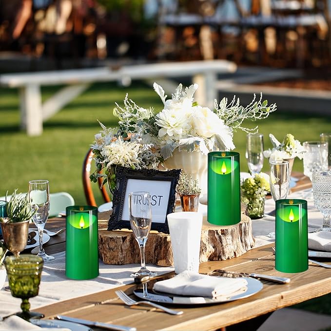 NURADA 3"x6"Flickering Flameless Candles: 3D Wick Acrylic Battery Operated LED Pillar Candles with Remote and Timer for St. Patrick's Day Home Holiday Forest Christmas Party Table Decor - Green