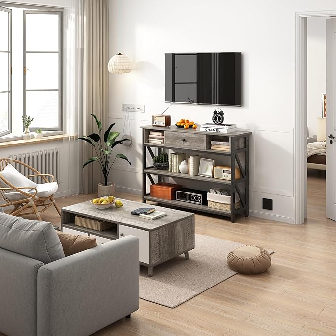 Mexin 39 Inch Console Sofa Table with Drawer, Entryway Table with Storage Shelves, Industrial Wood Hallway Table for Living Room, Couch, Foyer, Kitchen Counter, Grey Oak