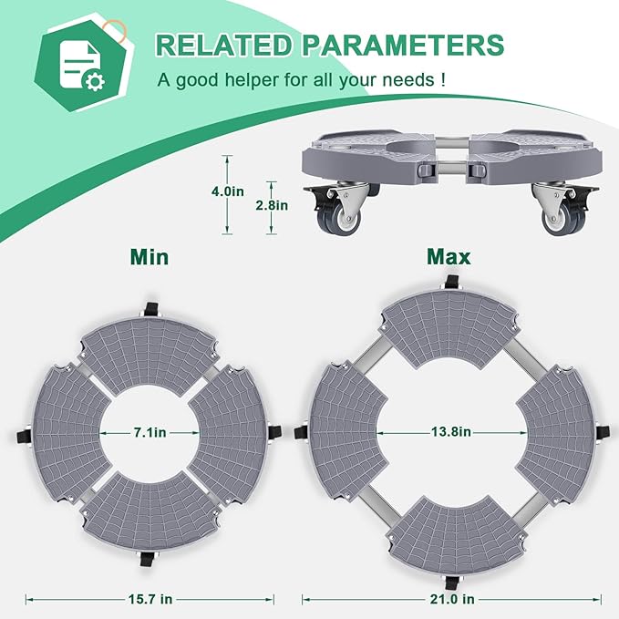 - Fits Planters of Various Sizes: This plant caddy with wheels can be adjusted in size from 7in-22in by pullable buckles. Your problem of moving planters of various sizes can be easily solved with only one of this plant caddy (Note: Do not exceed the outermost tick marks at both ends of the connecting tubes)