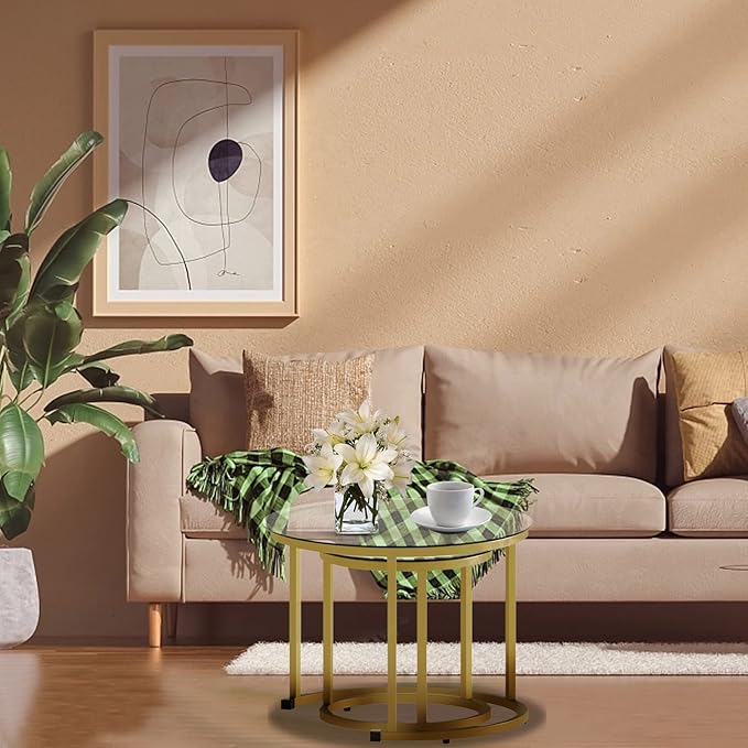 aboxoo Gold Nesting Coffee Table Set of 2, Small Glass Round Nesting Tables for Living Room Bedroom, Accent Tea Table with Metal Frame Modern Industrial Simple