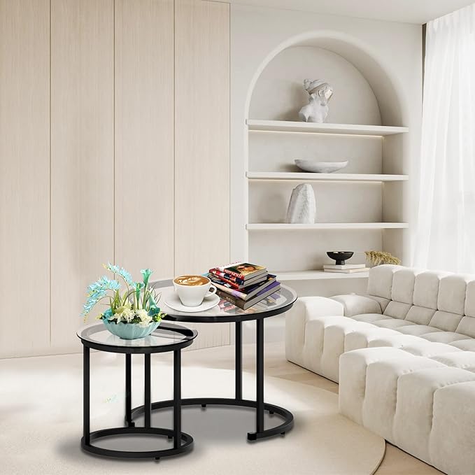 - ✔COMBIME AS YOU LIKE: Nesting coffee tables include a large table (Φ 23.6 × 17.7 inch) and a small table (Φ 15.7 × 15.7 inch). A small table can be placed under the bigger one. You can combine them as you like.