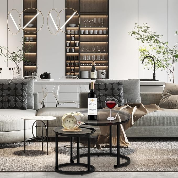 aboxoo Black Nesting Coffee Glass Table Set of 2, Metal Freme Side End Tables for Living Room Bedroom for Apartment Small Place Modern Industrial Simple, 23.6D x 23.6W x 17.7H in