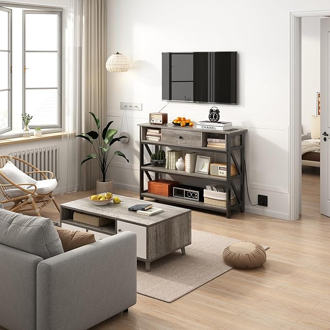 Mexin 39 Inch Console Table with 2 Outlet and 2 USB Ports, Entryway Table with Drawer and Storage Shelves, Narrow Sofa Table for Living Room and Hallway, Grey Oak