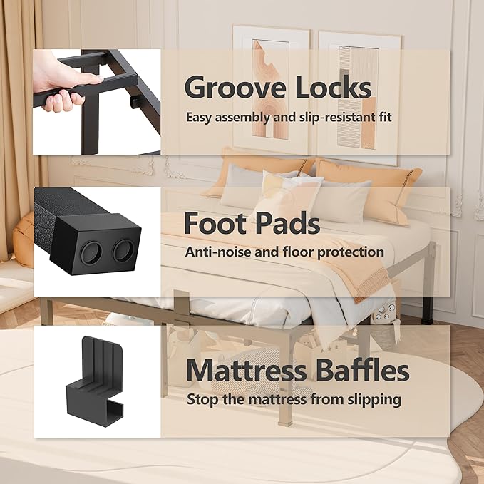 - Special Feature : 12.4 inch Under-bed Storage Space, Anti-slip Mattress Stopper, No Box Spring Needed, Reserved Headboard Holes and Noise-free Rubber Pads, Squeak Resistant 12.4 inch Under-bed Storage Space, Anti-slip Mattress Stopper, No Box Spring Needed, Reserved Headboard Holes and Noise-free Rubber Pads, Squeak Resistant