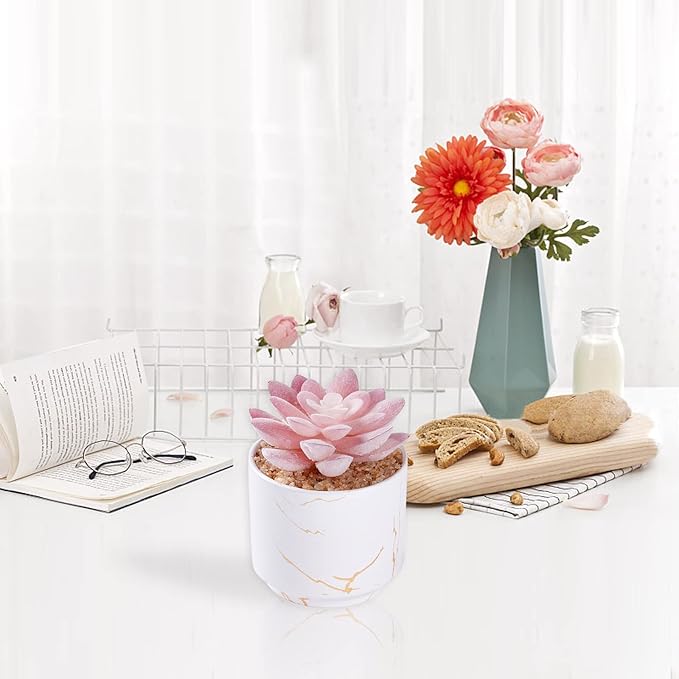 - UNIQUE DESIGN: Fake succulents with fake flowers pots are made of 100% White ceramic with gilt craftsmanship. Succulent Plants Artificial unique modern retro shape plus Purple succulent and simple decoration can make your office space or furniture decoration bright and positive for a happy start to your day