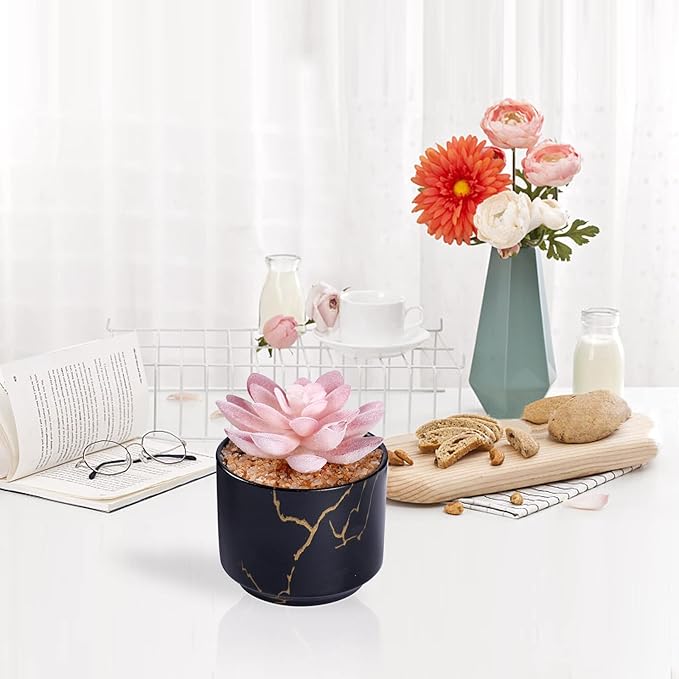 - UNIQUE DESIGN: Fake succulents with fake flowers pots are made of 100% Black ceramic with gilt craftsmanship. Succulent Plants Artificial unique modern retro shape plus Purple succulent and simple decoration can make your office space or furniture decoration bright and positive for a happy start to your day
