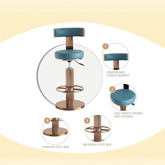 - 【Suitable For Many Occasions】The height adjustable swivel bar stools has a simple and stylish design, perfect for bar counters, kitchen counters, restaurant cafe counters, shop counters and more. With a curved back and a large 14.2" blue round seat cushion, the island rose gold bar stools provide a comfortable sitting experience for everyone.