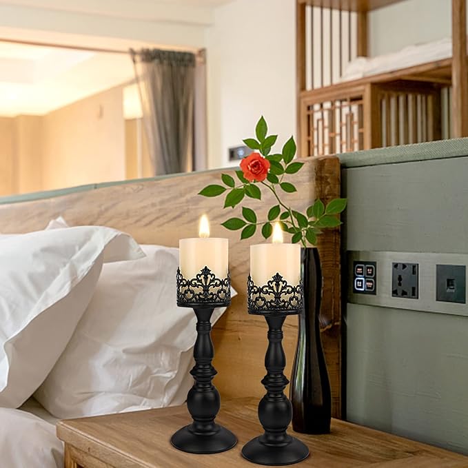 Candle Holders for Pillar Candles Gothic Matte Black Vintage Tall Candle Holders Set of 2 Decorative Large Table Centerpieces Candle Stand Decor (Black 2PCS A)