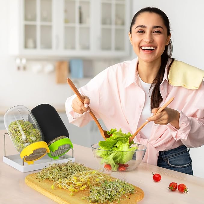 Seed Sprouting Kit, 2 Large Wide Mouth Mason Jars with Sprout Lids, Blackout Sleeves, Drain Tray, Stainless Steel Stand, Sprouts Growing Kit for Bean, Broccoli, Alfalfa (Yellow+Green)