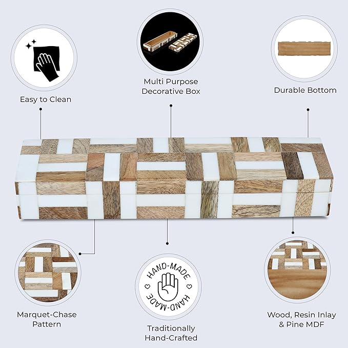 - Artisan-Crafted Decorative Storage Box – From the Marquet Chase Collection, this handmade box blends natural wood with Resin in a mesmerizing geometric pattern. Crafted on a durable Pine MDF frame, each box is a testament to Indian artisan skill and heritage craft techniques.