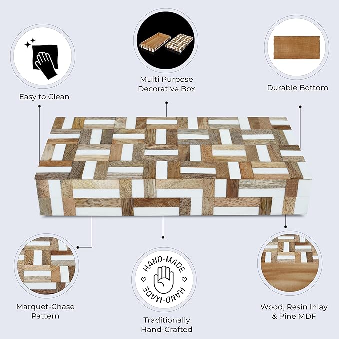 - Artisan-Crafted Decorative Storage Box – From the Marquet Chase Collection, this handmade box blends natural wood with Resin in a mesmerizing geometric pattern. Crafted on a durable Pine MDF frame, each box is a testament to Indian artisan skill and heritage craft techniques.