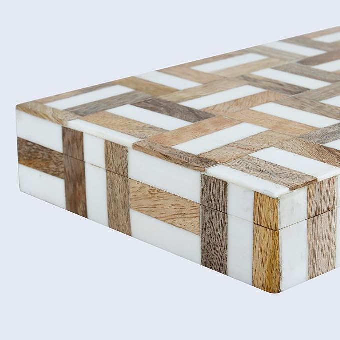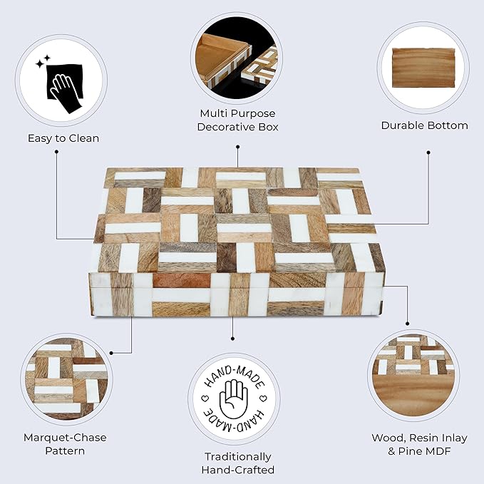 - Artisan-Crafted Decorative Storage Box – From the Marquet Chase Collection, this handmade box blends natural wood with Resin in a mesmerizing geometric pattern. Crafted on a durable Pine MDF frame, each box is a testament to Indian artisan skill and heritage craft techniques.