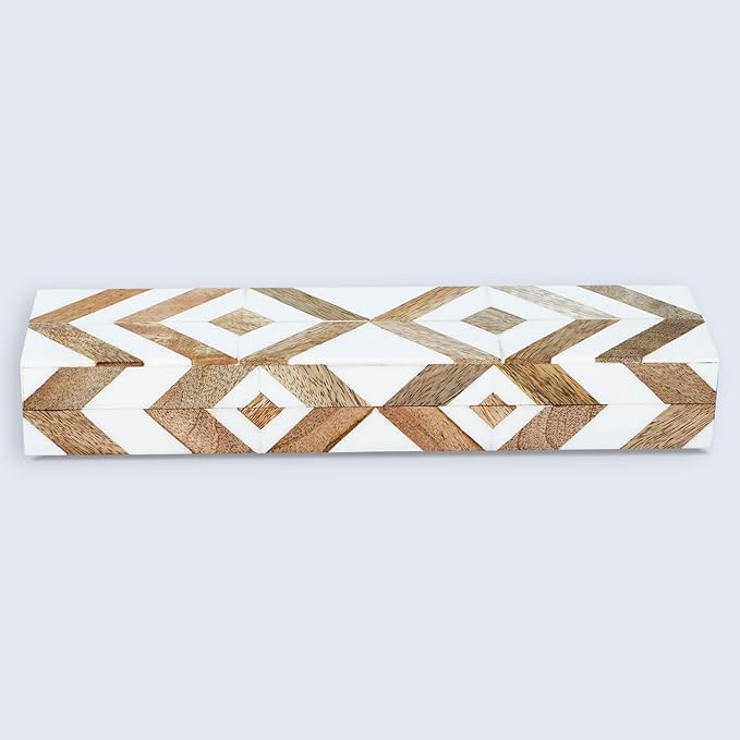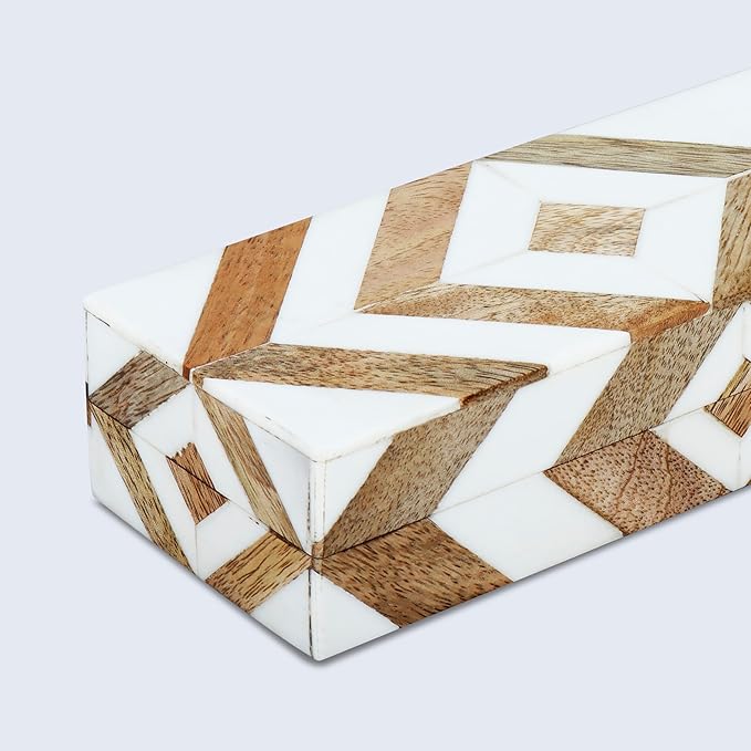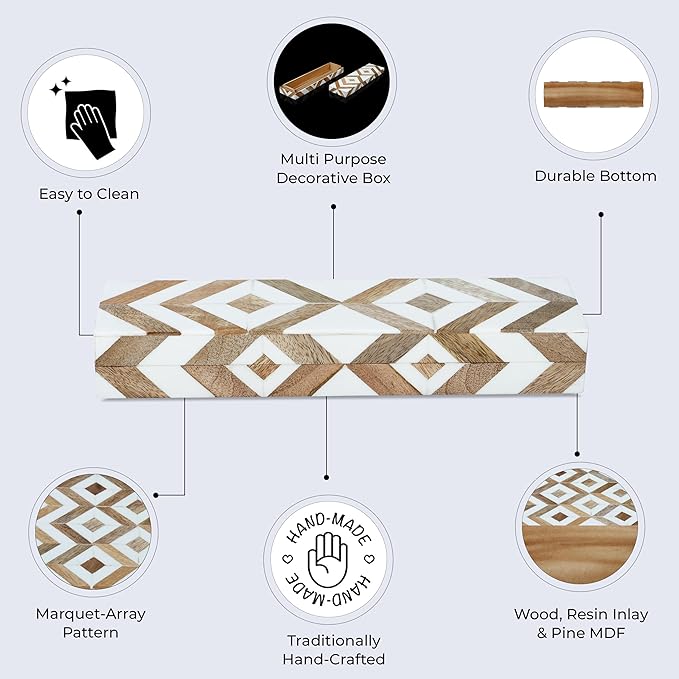 - Handmade Decorative Box Crafted by Skilled Artisans – This exquisitely Handmade Box from the Marquet Array Collection showcases a Bold Geometric Pattern with a blend of Resin Inlay and Natural Wood, structured on a durable Pine MDF base. A true Artisan crafted piece, made in India with heritage craftsmanship.
