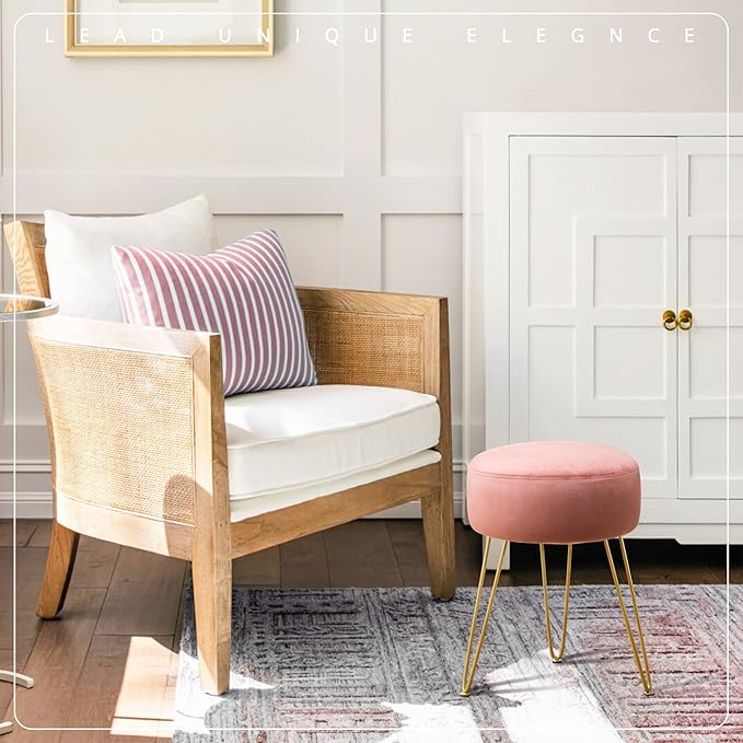 LUE BONA Vanity Stool, Pink Vanity Stools for Makeup Room, Round Ottoman Foot Stool, Velvet Footrest Vanity Chair for Bathroom Vanity, Bedroom, Living Room, Entryway, Offices