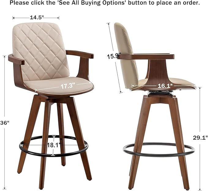 - Solid Natural Bentwood & Sleek Modern Design: Crafted from durable bentwood with a sleek walnut finish; supports up to 330 pounds for sturdy construction; upholstered in high-quality faux leather, making these swivel bar stools waterproof and easy to clean; ideal for kitchen countertops and cafes