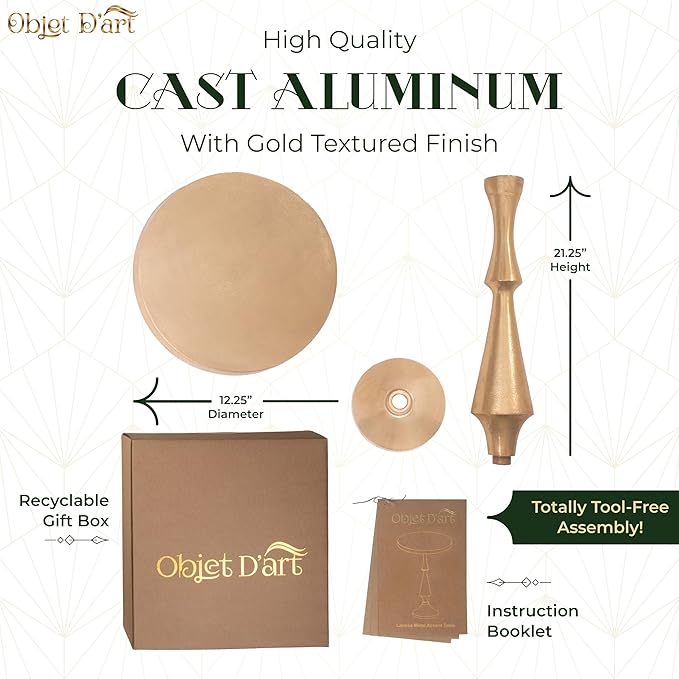 - UNIQUE HOME DECOR Made from high quality cast aluminum, our metallically accented side tables are handcrafted by skilled artisans. Along with its excellent resistance to corrosion, it has an antique gold finish that's sure to set you and your home apart. This accent table is lovely and distinctive by design.