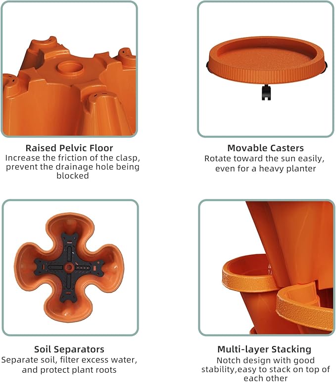 Strawberry Vertical Planters, 3 Tiered Stacking Tower Garden, Stackable Herb Vegetable Planters with Movable Casters and Bottom Saucer Indoor and Outdoor