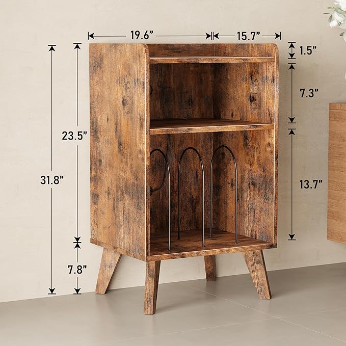 - 【Ideal Record Player Stand】Record stand give your living room or entertainment space a retro look . Fit for small than 15.6"-19.7" vinyl record player, This stylish end table has three storage areas. The top layer holds the turntable, the middle layer holds audio accessories, and the bottom divider section holds vinyl records. Perfect for storing vinyl records, albums, magazines, etc. It can be used not only as a vinyl stand , but also as a bedside table,nightstand and side table.
