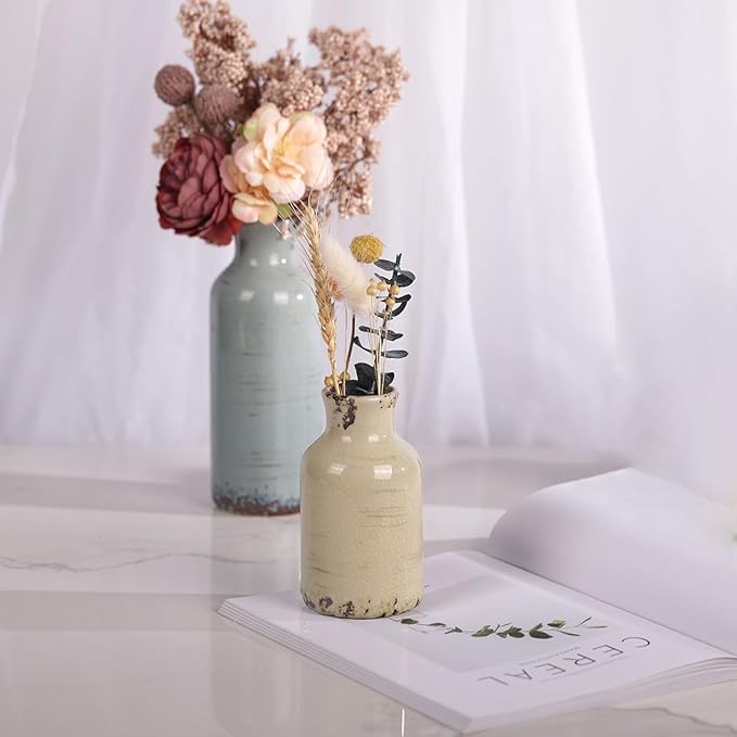 - Create A Beautiful Centerpiece - This Multi-color Distressed Ceramic Vase Set Will Fit In With An Abundance Of Styles; Modern Farmhouse, Rustic, Classic Charm, Country, And Elegant Yet Simplistic. (Measuring 2.95”L X 2.95”W X 9.85”H; 2.75”L X 2.75”W X 7.5”H; 2.75”L X 2.75”W X 4.9”H)