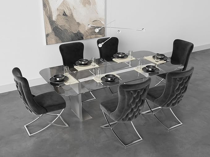 Ottomanson Royal Dining Chairs Set of 8 – Upholstered Tufted Microfiber, Assembled, Silver Metal Legs, Beech Wood Frame, 350 lb Capacity, Gray