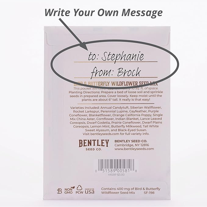 - GROW GOOD THINGS: At Bentley Seeds, we pride ourselves on providing consistent and high-quality flower seeds. Bentley Seed Co. offers multiple packet sizes, paper choices, and many seed varieties to accommodate any event. All of our favor packets comply with USDA and all 50 States Dept. of Agriculture guidelines. Packet size: 3 ¼" x 4 ½".