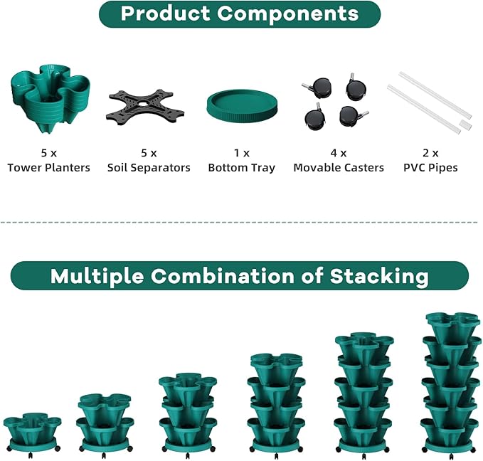 - 5 Tier Vertical Planter - 5 tier stacking planter, made of BPA-free material, can hold up to 20 different plants, such as strawberries, spinach, leaf lettuce, arugula, and mustard greens, and a few smaller herbs and flowers. Plus, it's the perfect vessel for strawberries as the berries cascade over the container lip.
