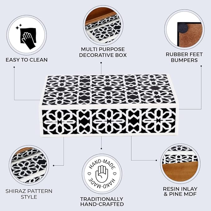 - Stylish Decorative Storage Box for Home Decor: Enhance your living space with a modern yet timeless decorative box featuring elegant handcrafted Shiraz patterns. Perfect as a coffee table decor accent, mantle piece, shelf organizer, or hallway console accessory, this box blends seamlessly with modern, boho, vintage, western, or minimalist interiors.