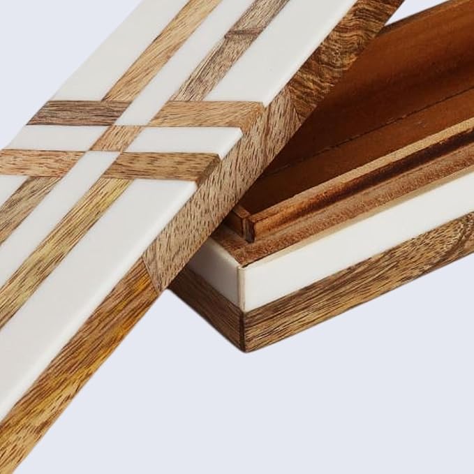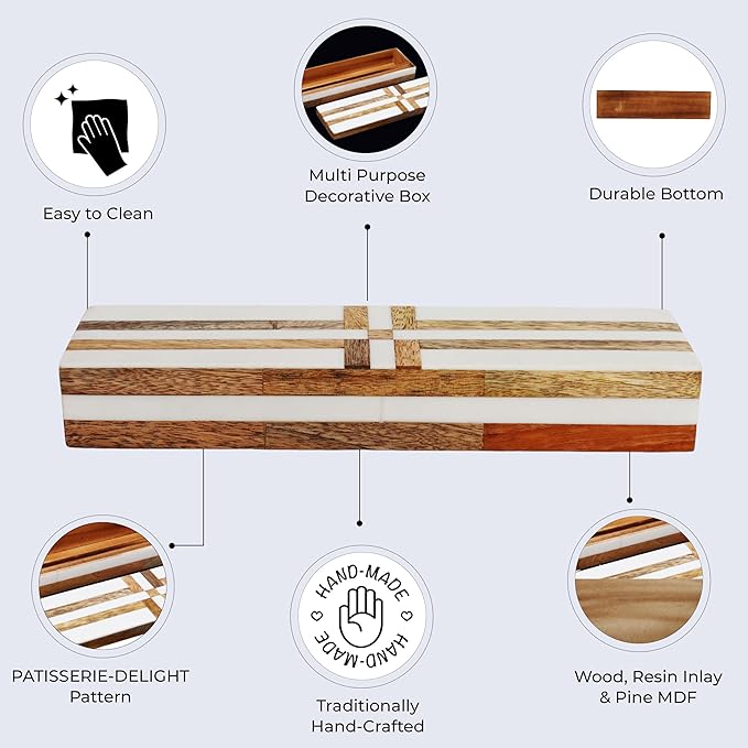 - Handmade Decorative Box Crafted by Skilled Artisans – This beautifully handcrafted box from the Patisserie Delight Collection features a striped pattern made from natural wood and smooth resin inlay, set on a solid Pine MDF base. Each piece is handmade by expert Indian artisans, bringing warmth, texture, and traditional skill into your modern home decor.
