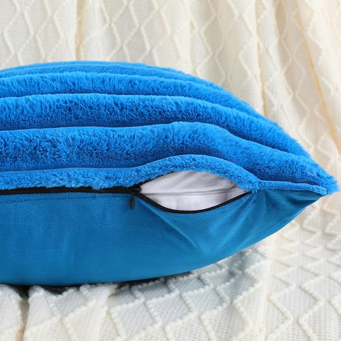 - Furry Material:The front of the pillow cover is fluffy and soft faux rabbit fur striped, No shedding of material. Velvet on the back, smooth and cozy Not fade resistant. A hidden built-in zipper on the side of the pillows cases for easy insert or remove pillow inserts