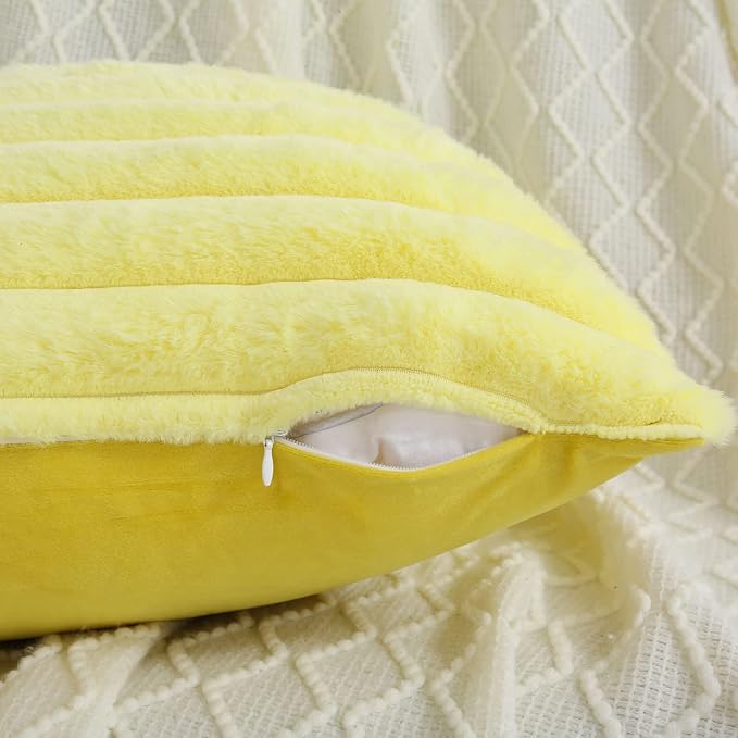 FUTEI Yellow Striped Decorative Throw Pillow Covers 22x22 Inch Set of 2,Square Fall Decorations Couch Pillow Case,Soft Cozy Faux Rabbit Fur & Velvet Back,Modern Home Decor for Bed