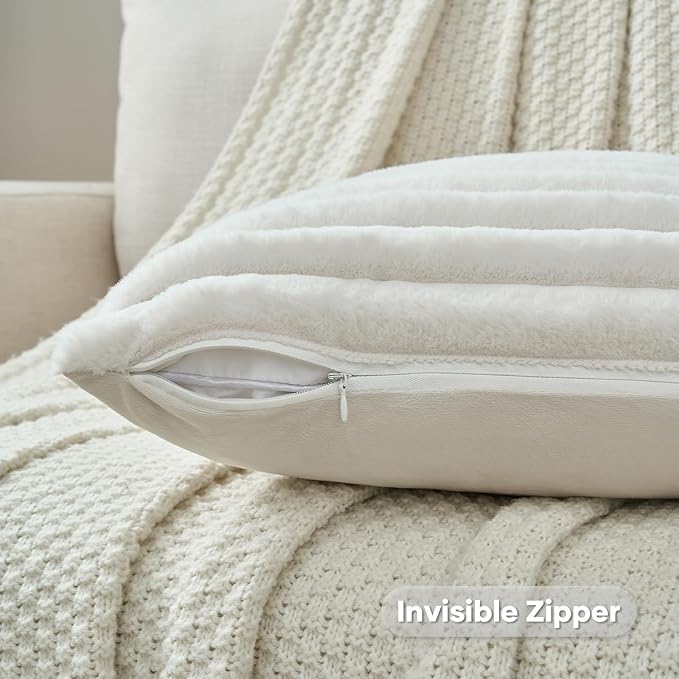 FUTEI Cream White Striped Decorative Throw Pillow Covers 20x20 Inch Set of 2,Square Fall Decorations Couch Pillow Case,Soft Cozy Faux Rabbit Fur & Velvet Back,Modern Home Decor for Bed