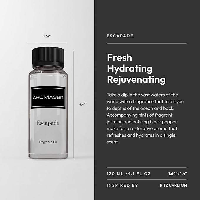 Aroma360 - Escapade Fragrance Oil Scent - Luxury Aromatherapy Scent Diffuser Oil - Hints of Lemon, Ocean, Bergamot, & Fragrant Jasmine - for Essential Oil Diffusers - for Home & Office - 120mL