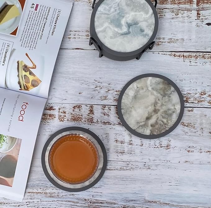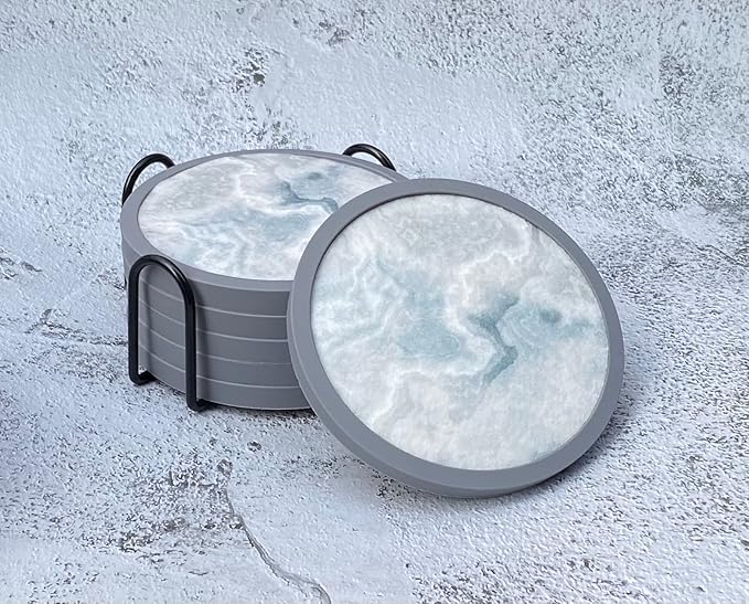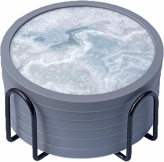 Absorbent Coasters for Drinks with Holder - 6packs, Silicone Coaster with Soft Felt Insert (4.3 inch Coasters with 4.5 inch Holder, Marble Style)