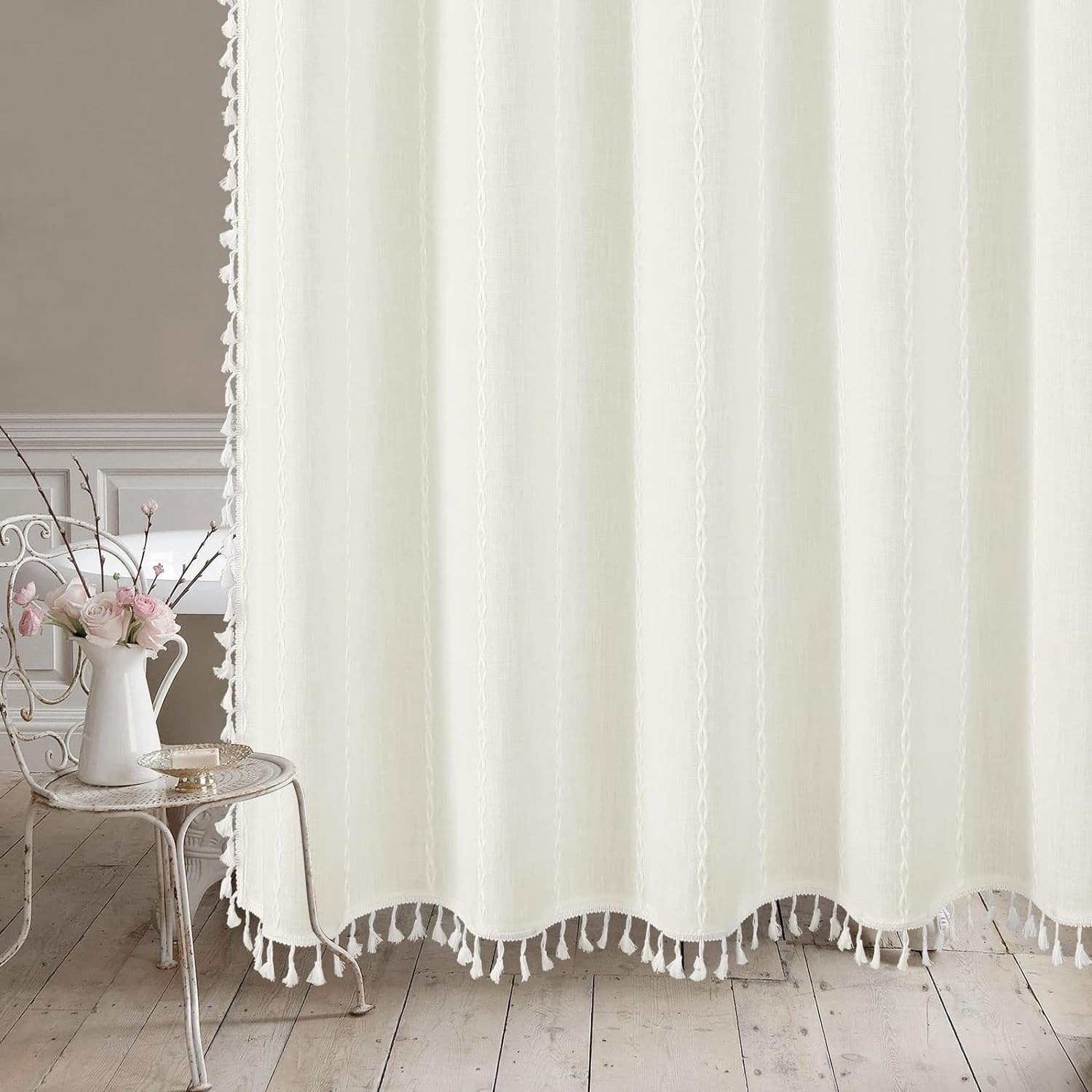 MitoVilla White Boho Extra Long Shower Curtain 72 x 84, Modern Farmhouse 84 inch XL Rustic Polyester Linen Tassel Heavy Duty Shower Curtain Set with Hooks for Cottagecore Country Bathroom Decor Ivory