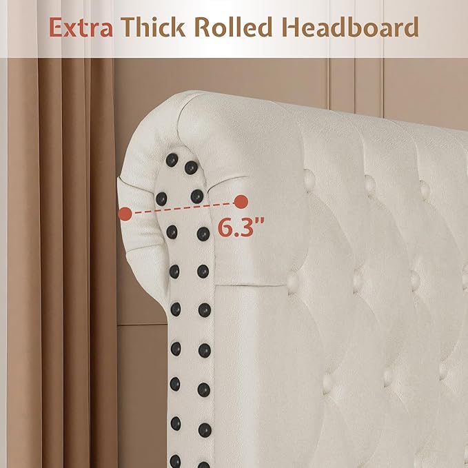 - 53" Sleigh Headboard: This upholstered bed frame features an elegant sleigh design with studded trim. Thoughtfully positioned deep tufted buttons provide both comfort and excellent back support.