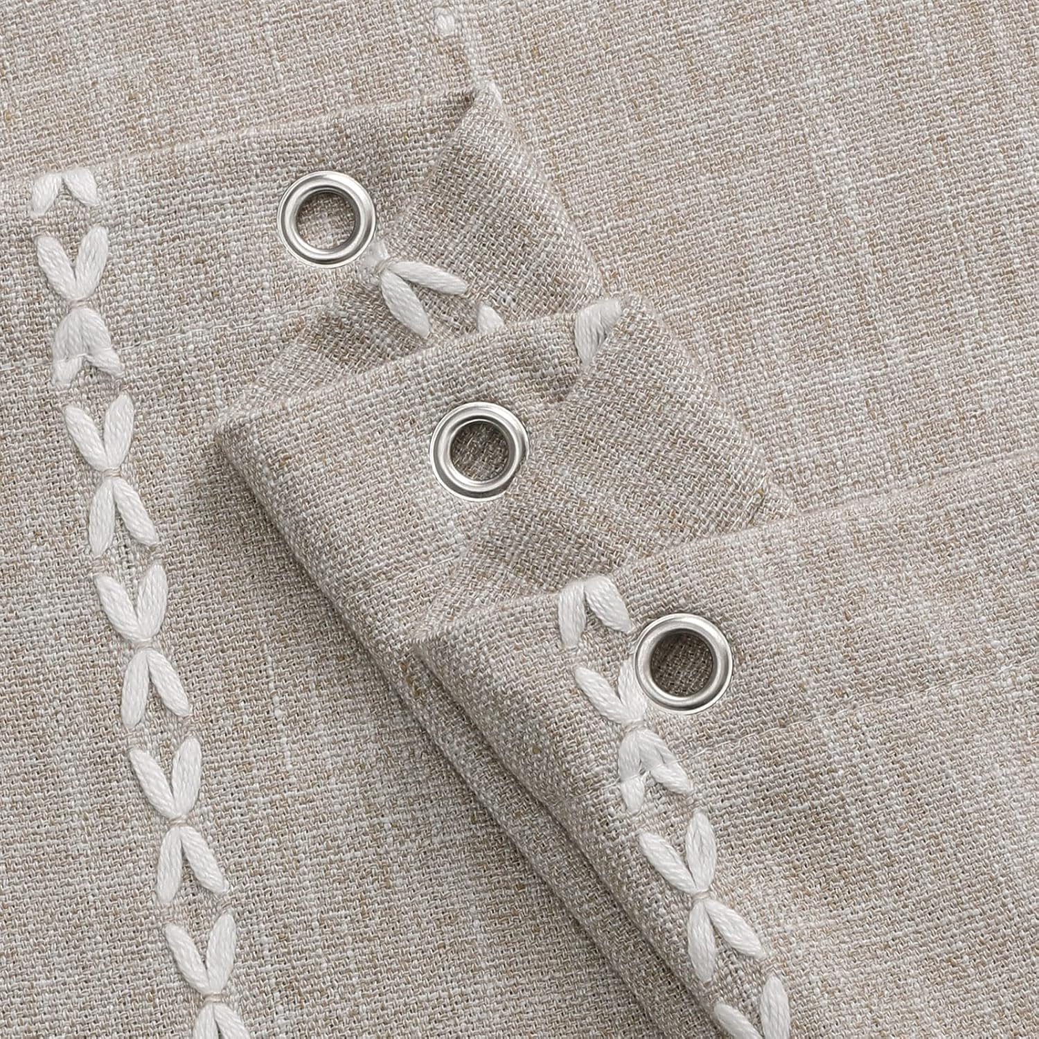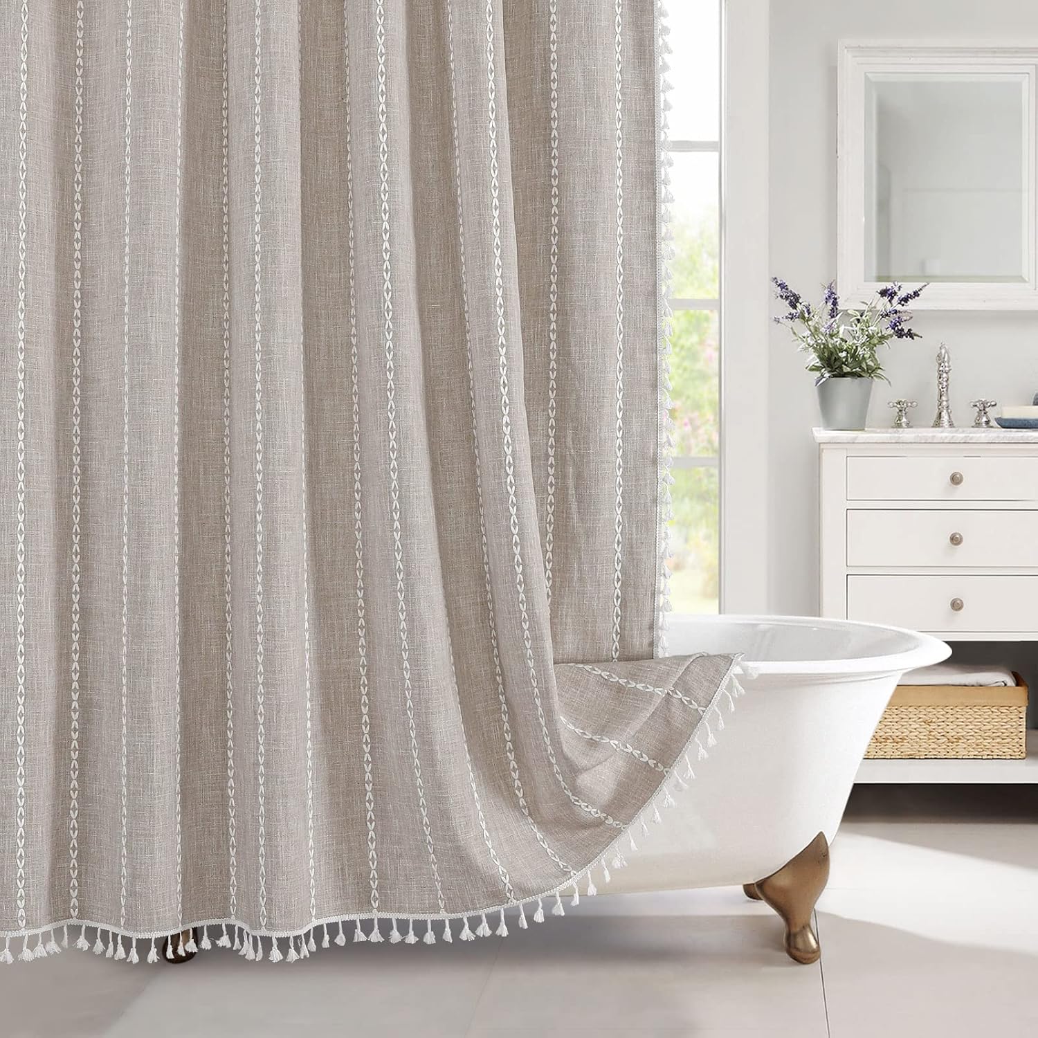 - Wrinkle Free & Ultra Thick Fabric - 310 GSM, 15% linen, 85% polyester creates farmhouse like effect for this taupe grey shower curtain, so that it could keep in place. The quality curtain is elegant and soft, which can deliver a rustic or country-like bathroom environment.