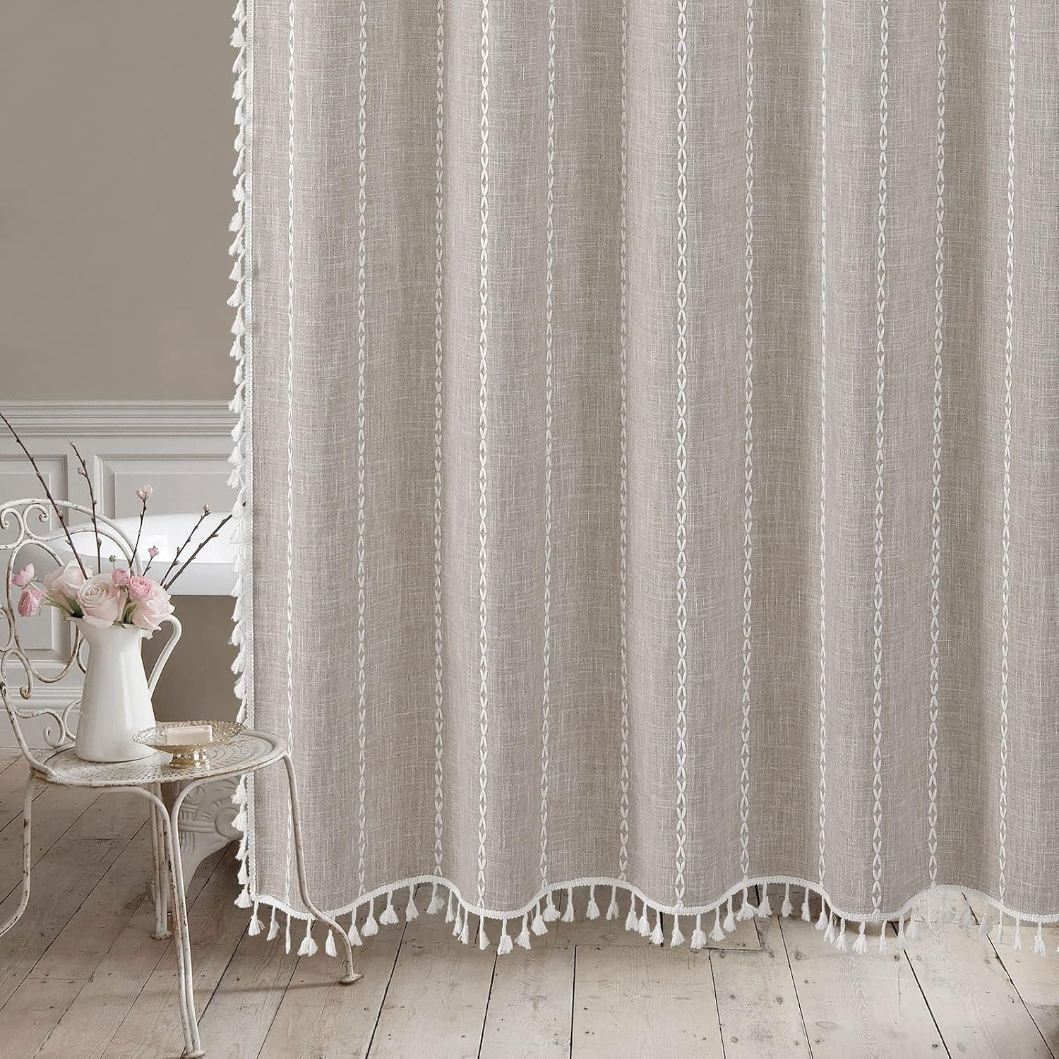 - Wrinkle Free & Ultra Thick Fabric - 310 GSM, 15% linen, 85% polyester creates farmhouse like effect for this taupe grey shower curtain, so that it could keep in place. The quality curtain is elegant and soft, which can deliver a rustic or country-like bathroom environment.