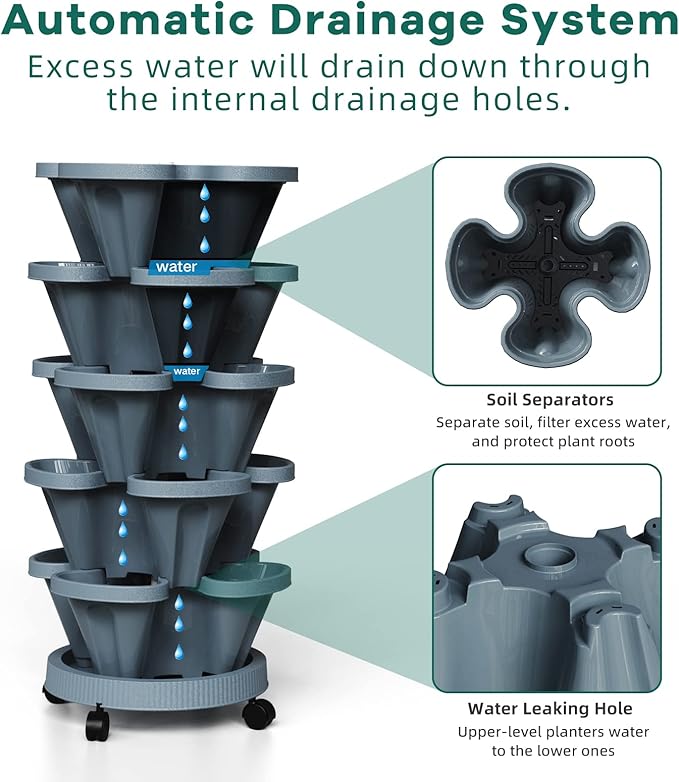 - Flow Design - The water filtration system from top to bottom can save water and retain moisture but prevents overwatering or root rot. 6 filters are placed on each level to keep the soil from going through the big drainage holes, it also helps retain water in each planter level.