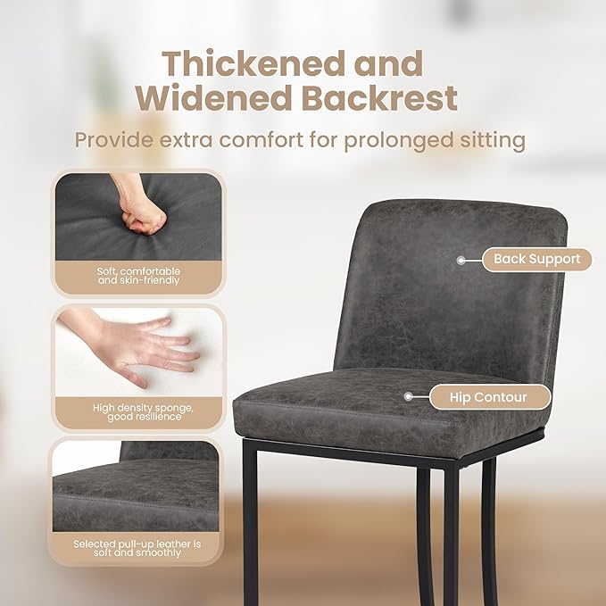 - 🥛Durability Bar Stools: Crafted with high-quality PU leather, is known for its durability and Animal-friendly. It is resistant to wear and tear, less prone to cracking or peeling compared to genuine leather. The cushions material has a nice pattern and texture to them and are surprisingly rather comfortable to the bum and back. It can be wiped clean with a damp cloth, easy to clean